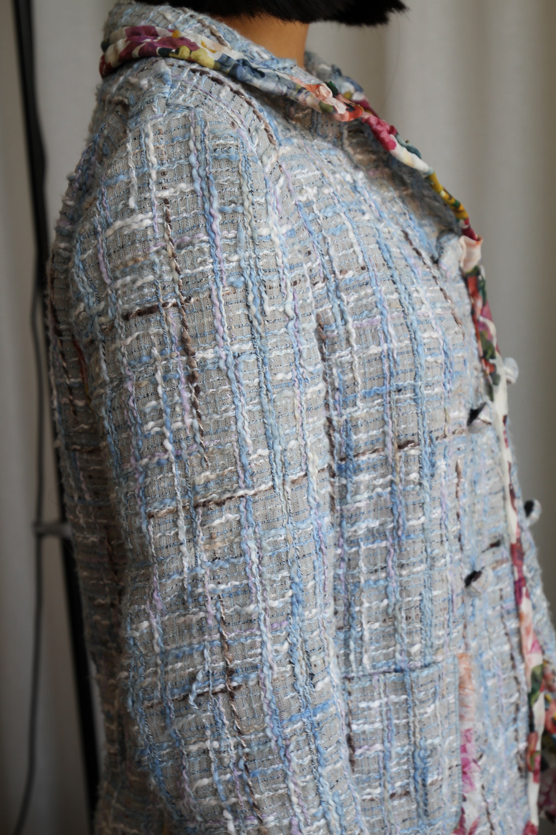 This vintage Dolce & Gabbana jacket is the perfect blend of classic tailoring and feminine charm. Made from luxurious blue tweed, it features subtle floral accents throughout the fabric, adding a delicate touch to its structured silhouette. The jacket is finished with floral lining and tweed buttons, exuding sophisticated elegance with every detail.