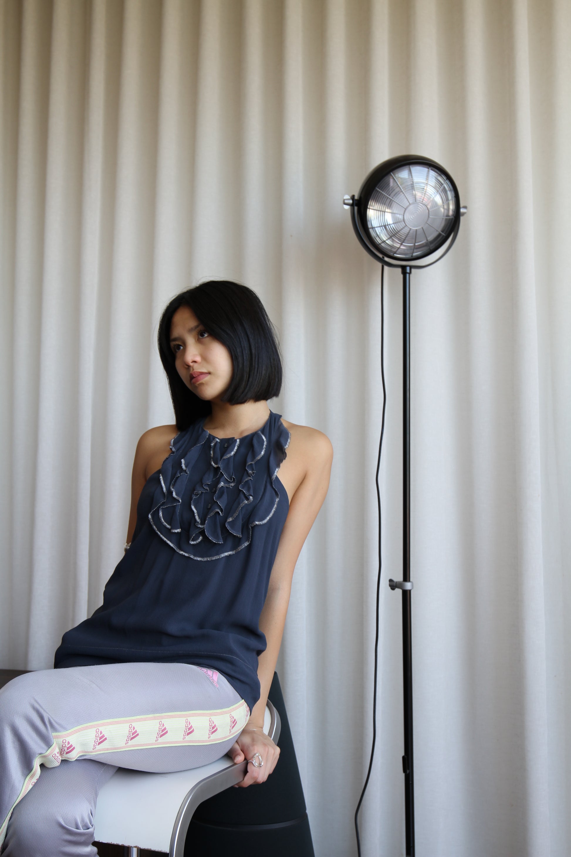 Preloved Sass & Bide Ruffle Halter, a statement piece with effortless glamour. This striking blue halter top features a cascading silver outlined ruffle front, adding the perfect touch of drama and elegance. Designed for a flattering fit, it accentuates the silhouette while offering a bold yet sophisticated look.